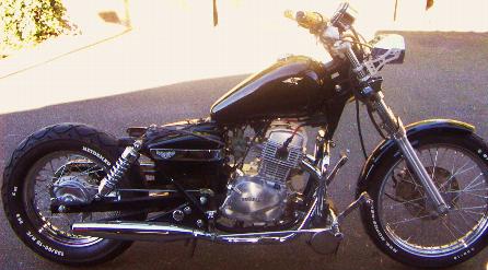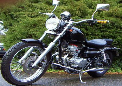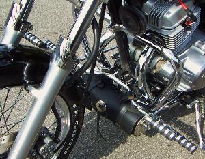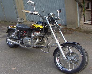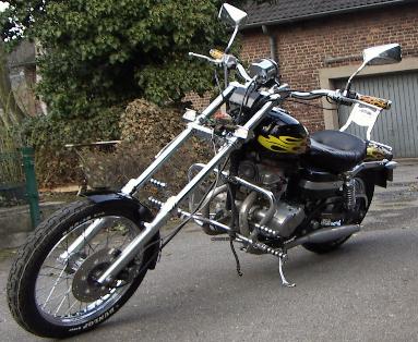 Vorverlegte Fußrastenanlage , Zündkerzensteker mit sichtbarem Zündfunken , Rotes Zünkerzenkabel , Custom Spiegel , Gabelprotektoren , Motorsturzbügel , Werkzeugrolle , Entfernung der Soziusfußrasten und mit Blenden versehen,diverse Anbauteile Hochglanz poliert .Umbau auf Solo mit nach vorn verlegter Sissy Bar (von einer 79'er Harley Superglide)